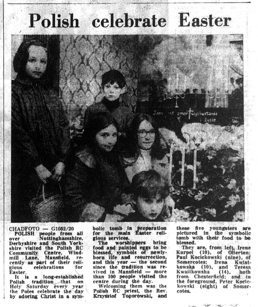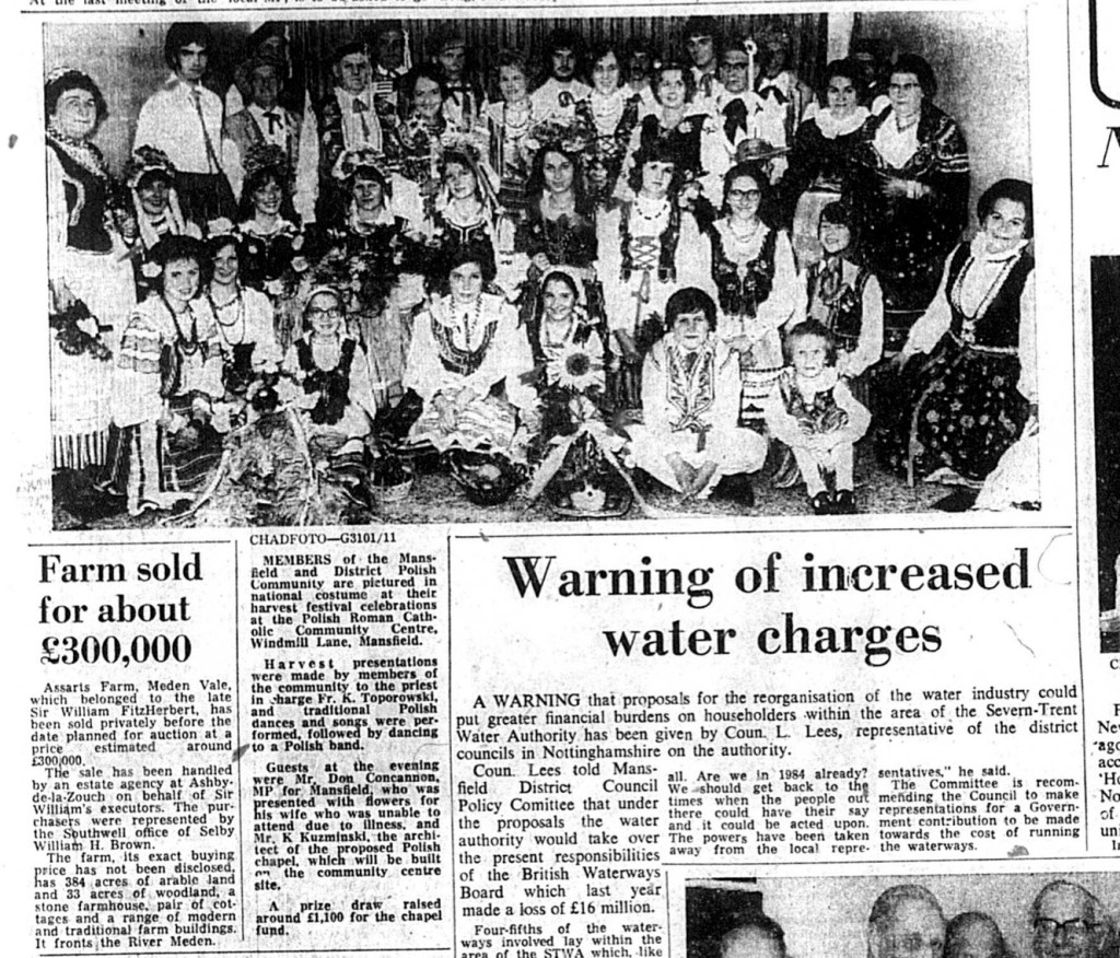 Polish mass was first held in Mansfield on 16th February 1947 by Fr. Andrzej Żyłka at Forest Town Hostel, and in 1949 began to be held regularly at St Phillip’s Neri on Chesterfield Road. The Polish Catholic Social Club was built in 1965 followed by the Church in 1978, consecrated on December 3rd by Bishop Władysław Rubin. An ex-combatants club was also active at 86 Leeming street.